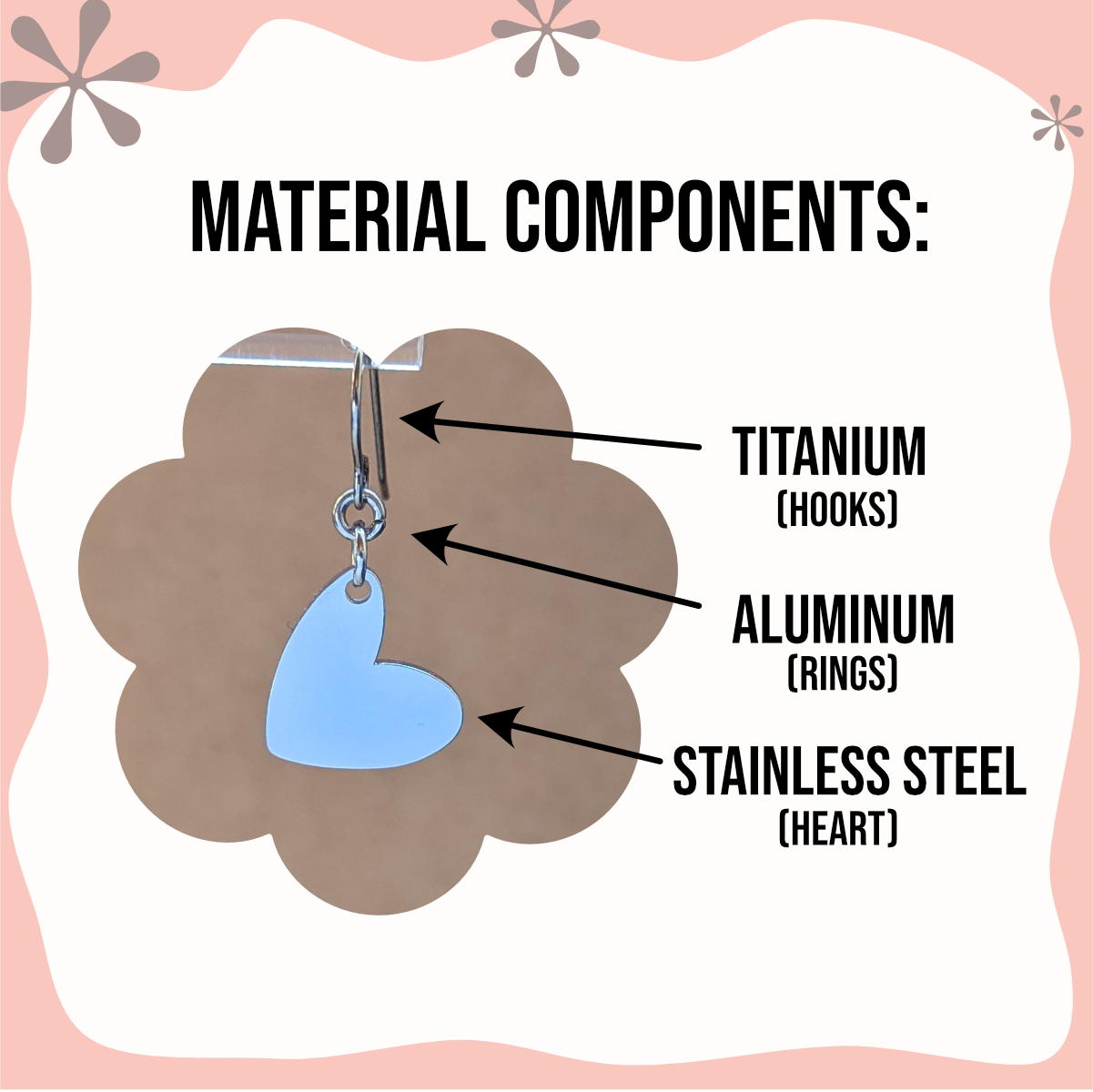 Titanium ear wires protect against allergic reaction and stainless steel hearts protect against tarnishing.